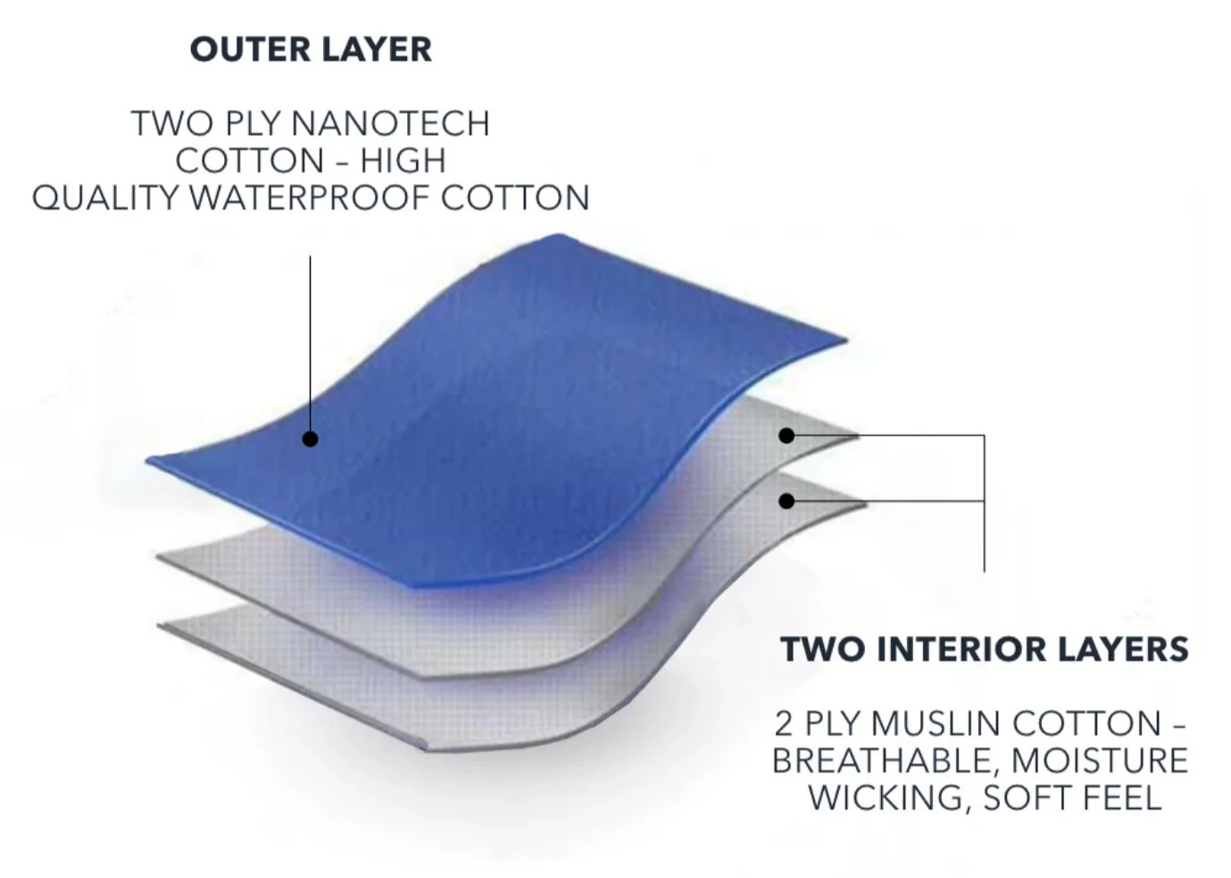 100% machine washable cotton. The outer layer is made from nanotech waterproof cotton for ultra water resistance. The 2 inner layers are breathable, moisture-wicking muslin cotton.
